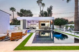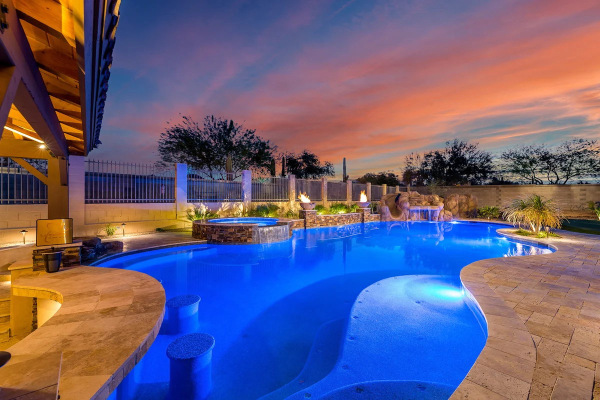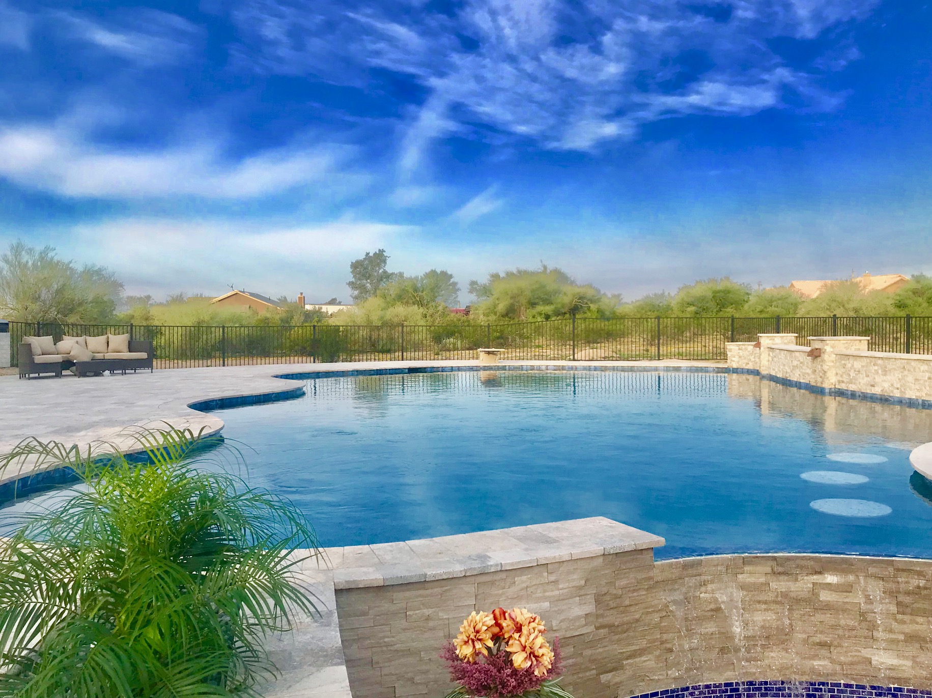 There are two pools that are my favorites of the year. The Martin pool in Surprise [photo above] and the Zoltenko pool in Mesa [photo below]. They both are stunning and fully loaded with water features, swim-up bars, tile top roofs, and LED color lighting. They are both extremely large pools – over 50’ long. They both combine the natural desert terrain with gorgeous bright blue water – Pebble Radiance, which has added glass bead and abalone shell – to make it a beautiful inviting pool. The lighting and fire at night give the pool added “wow” factor.