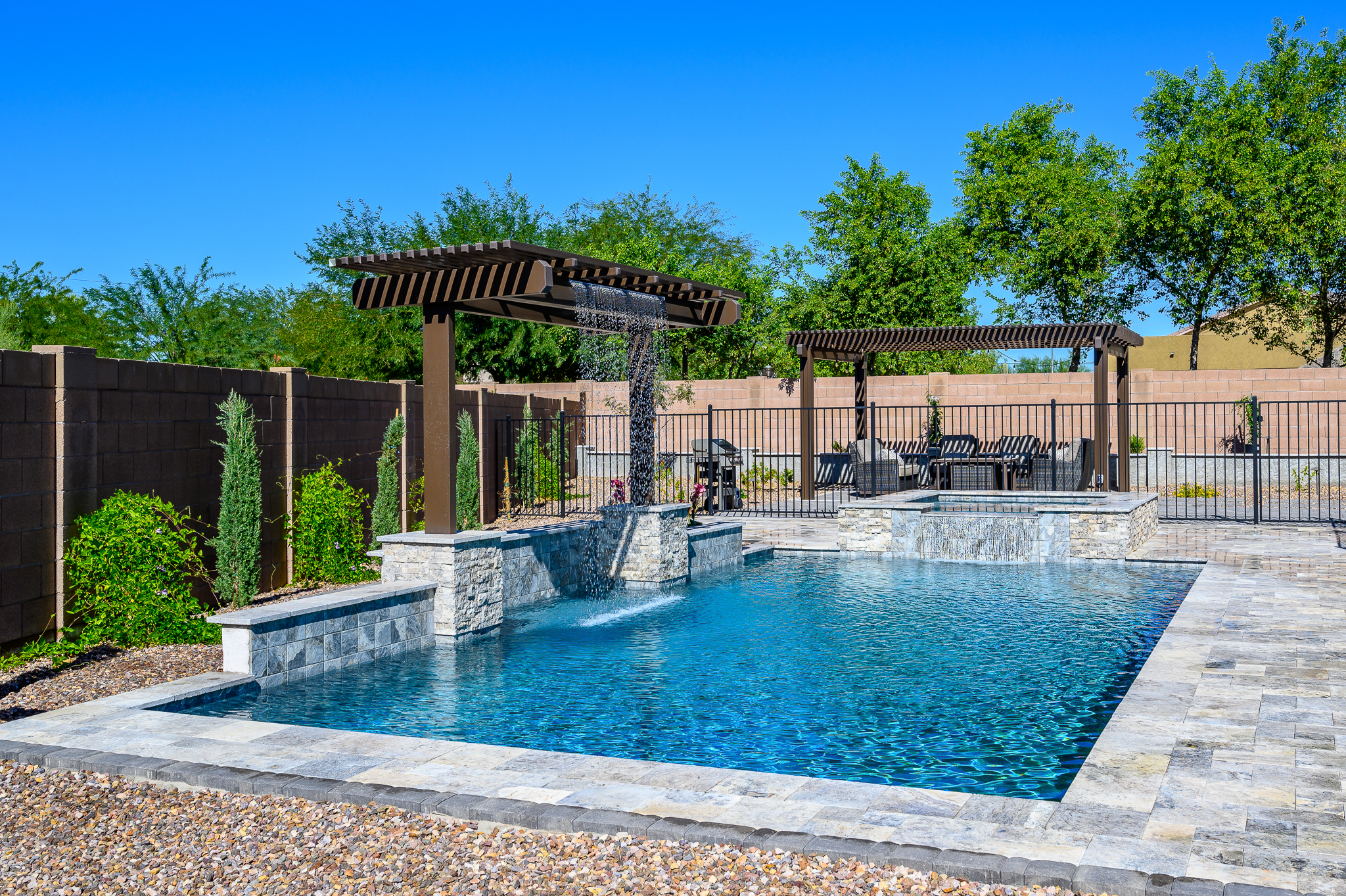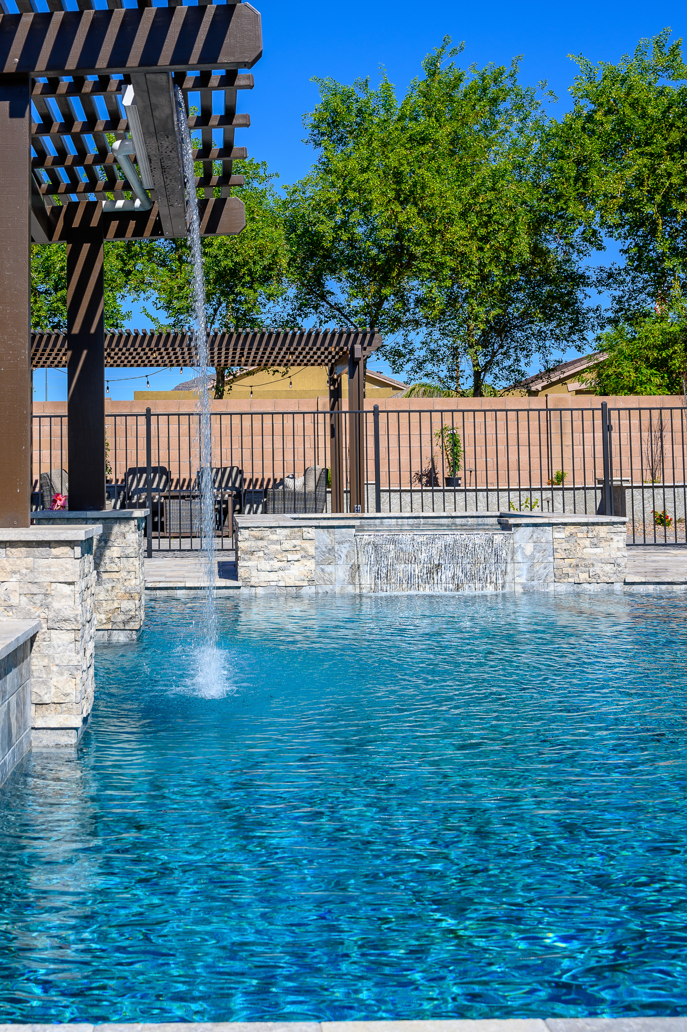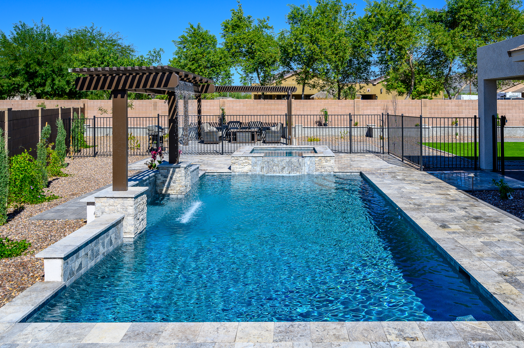Filling the yard while ensuring that it still feels open. We made sure that each area has its own feel depending on the occasion. While the pool and spa are the main attraction, the client also wanted a large seating area and plenty of turf for the kids to play games. They topped it off with an inground trampoline.