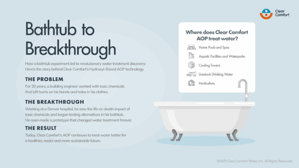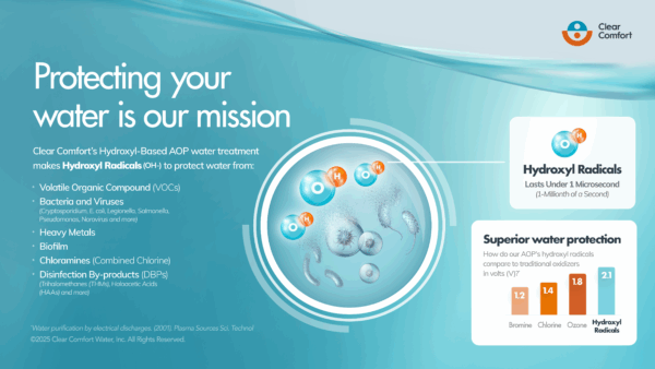 Inspired by nature, Clear Comfort’s advanced AOP (Advanced Oxidation Process) technology uses powerful hydroxyl radicals to rapidly destroy harmful contaminants while eliminating the toxic by-products of traditional chlorine sanitation.
